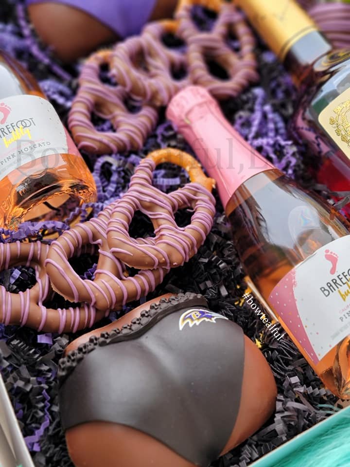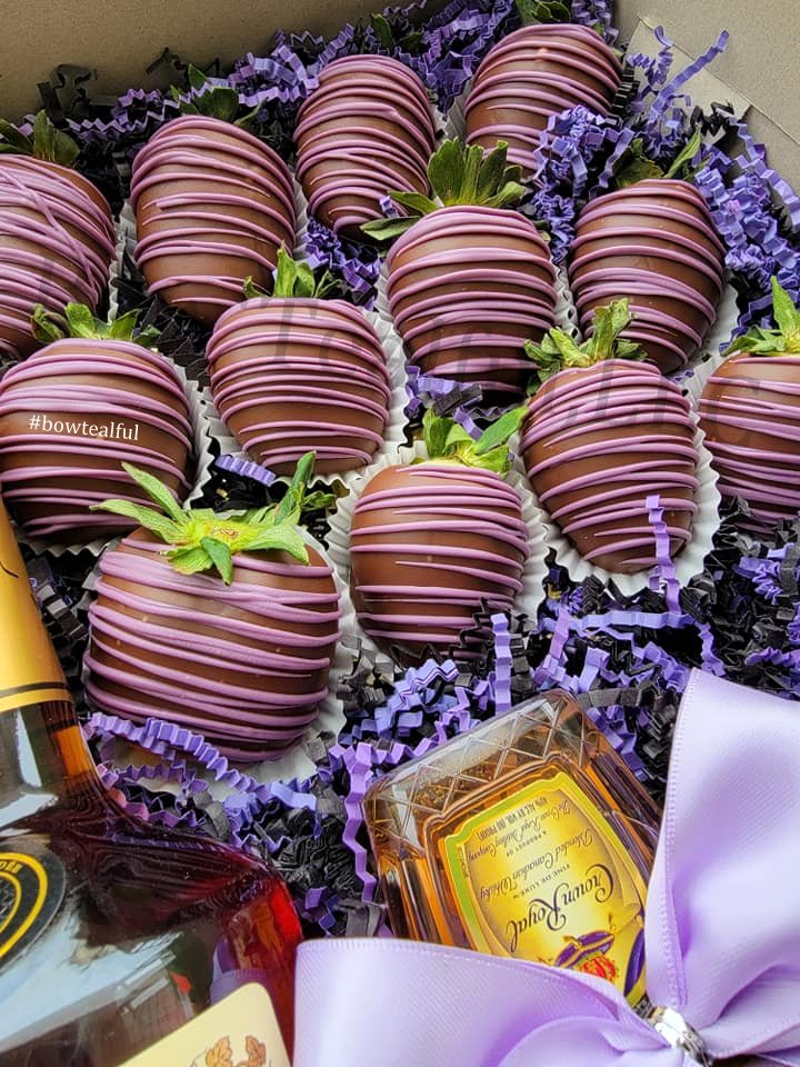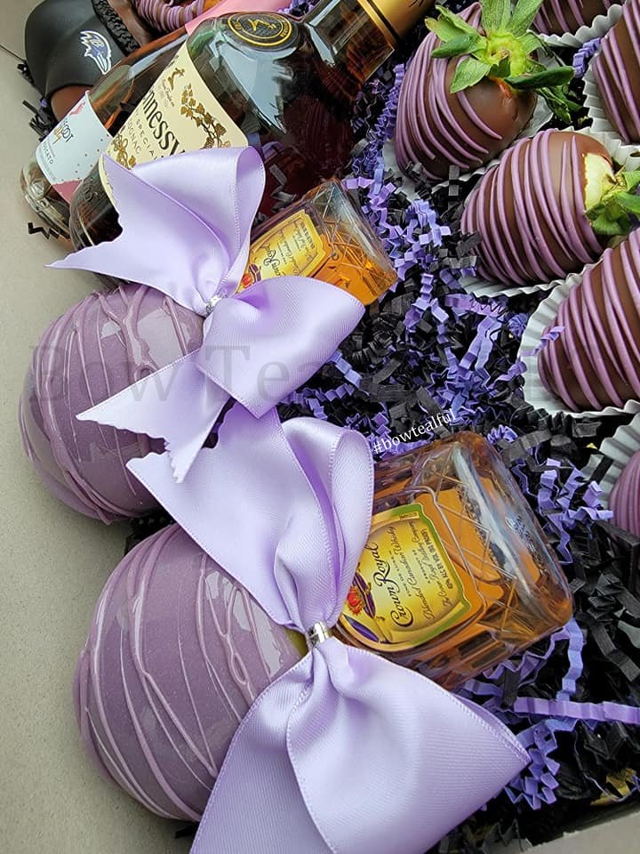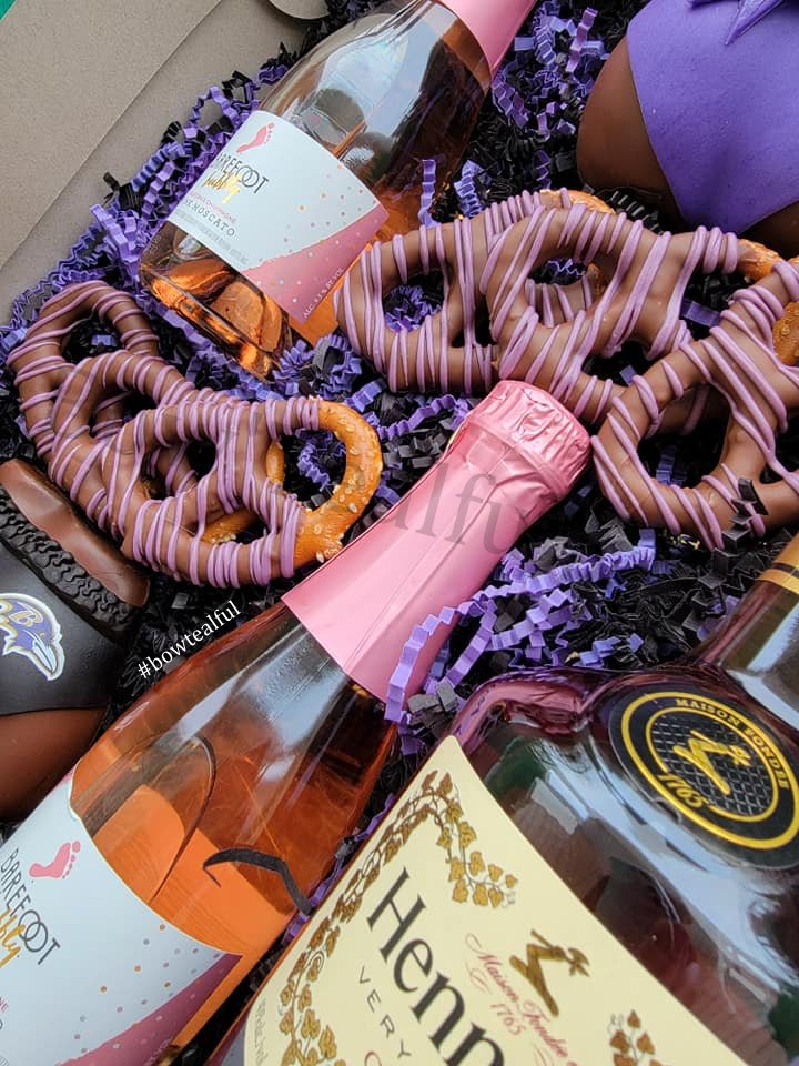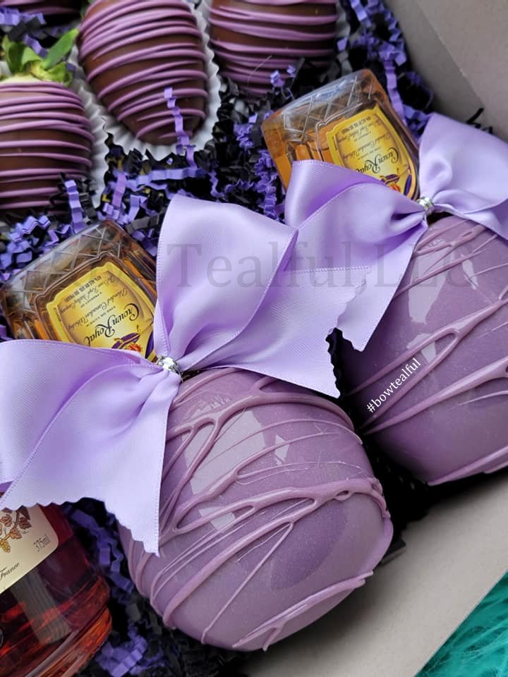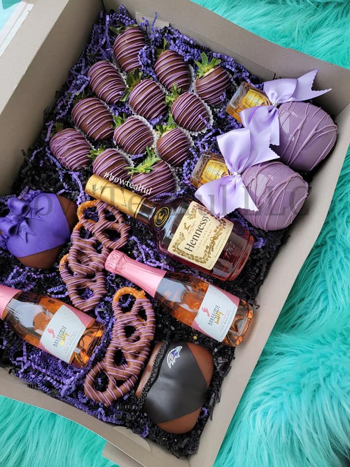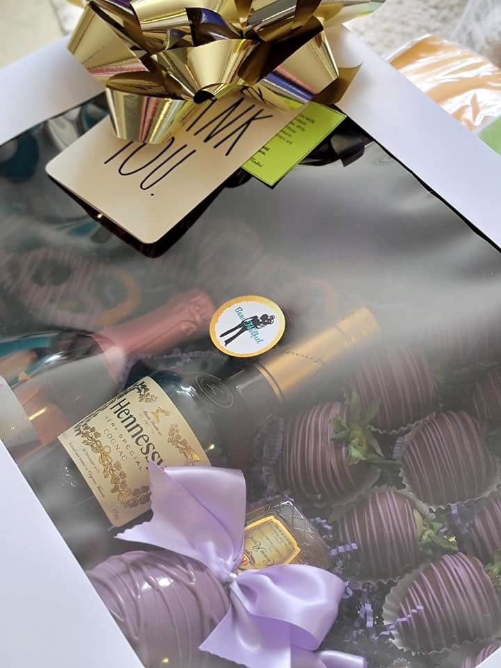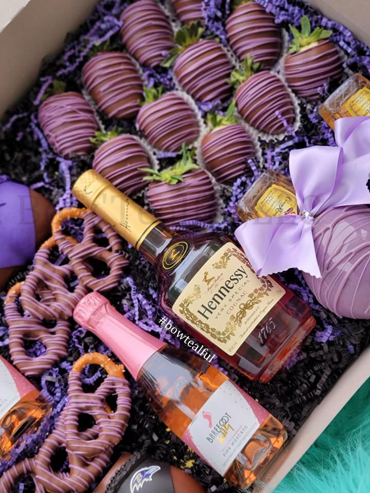 Indulge in these mouth-watering treats: 1 dozen chocolate-covered strawberries, 2 mini wine bottles, 2 Drunk'n Candied Apples, 6 chocolate-covered pretzels, 2 chocolate booties in cute panties, and 1 bottle of Hennessey. Please note that if you prefer a different liquor, such as Patron or 1800, please message me first, as this may increase the price.