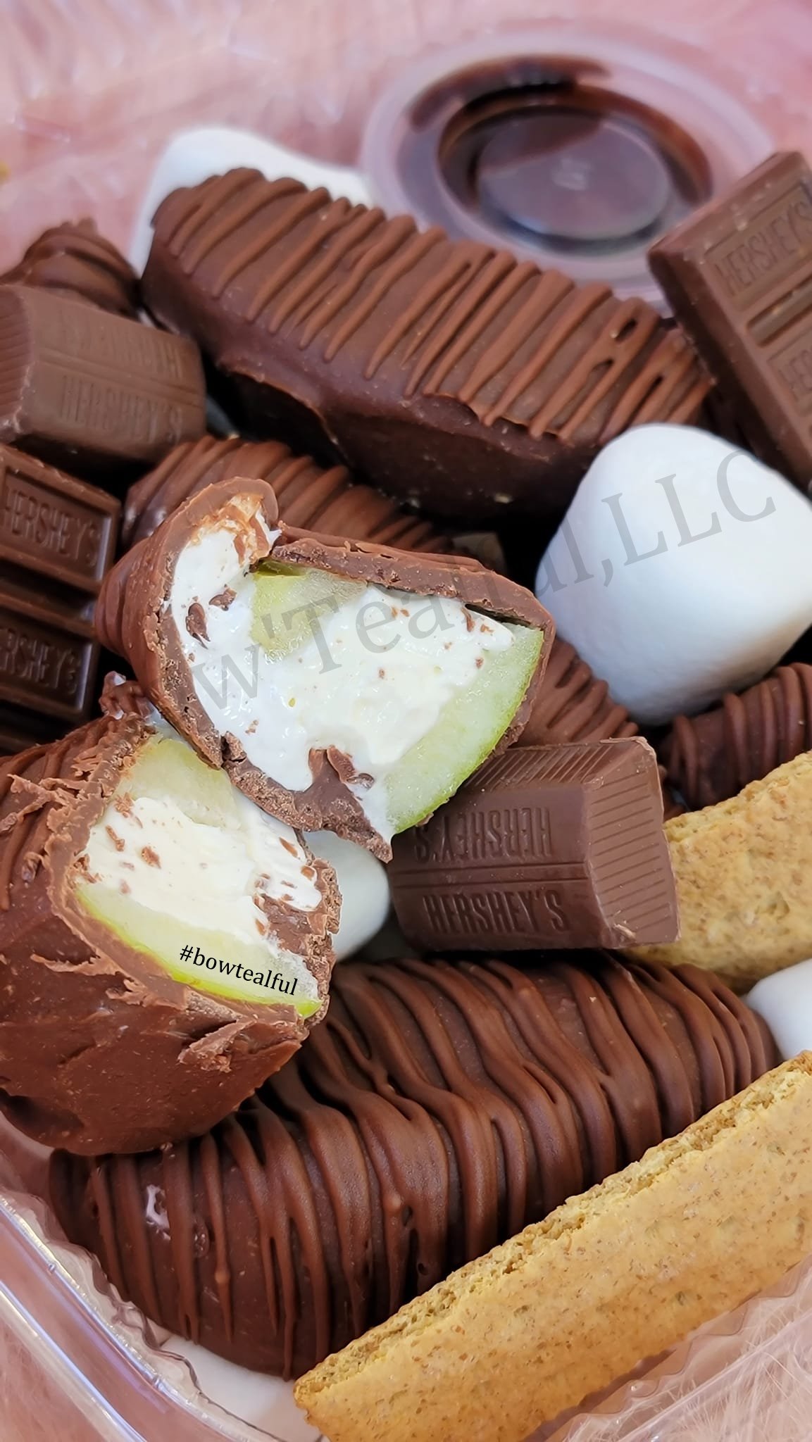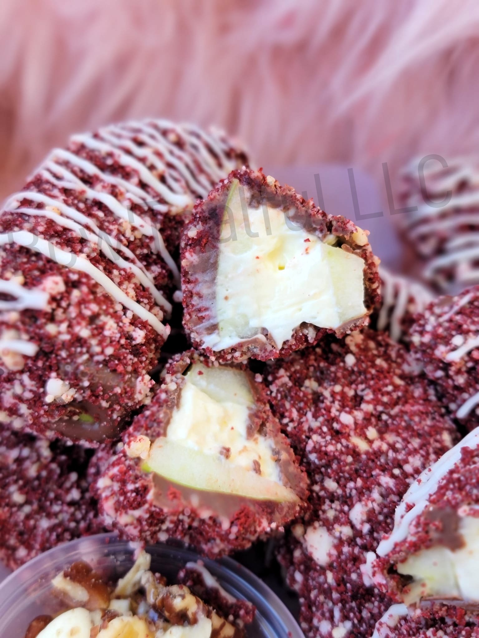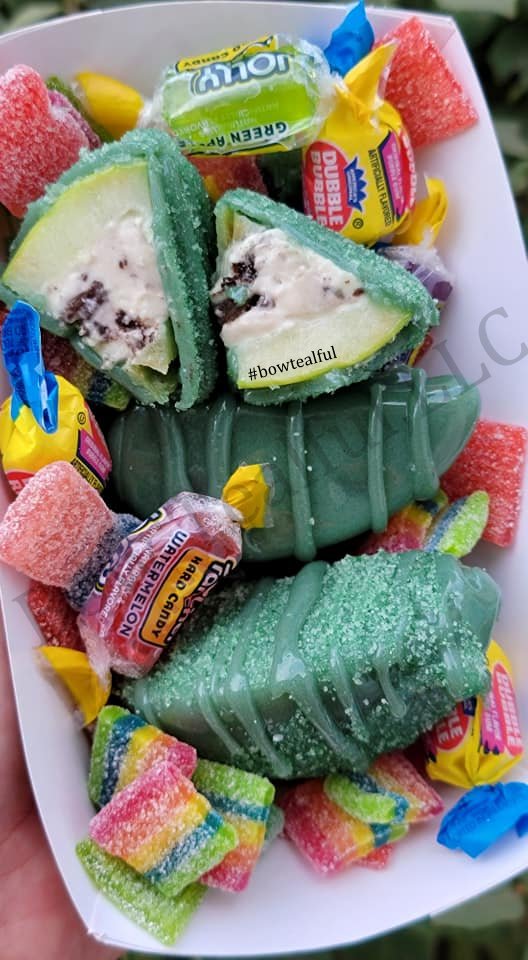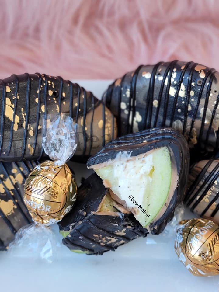 Bow'Tealful's expertise shines through. Apple slices filled with cream cheese/ cheesecake then dipped in chocolate, exemplify pure indulgence. Our Delicious Stuffed Apple Slices guarantee every bite is a sublime experience. CLICK THE DEFAULT TAB FOR MORE OPTIONS. THIS SCRUMPTIOUS TREAT NEEDS 48/HRS IN ADVANCE NOTICE. DON'T FORGET TO ADD DELIVERY TO YOUR CART.