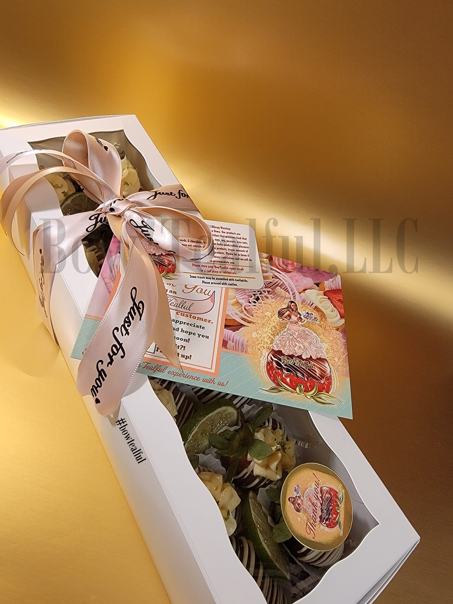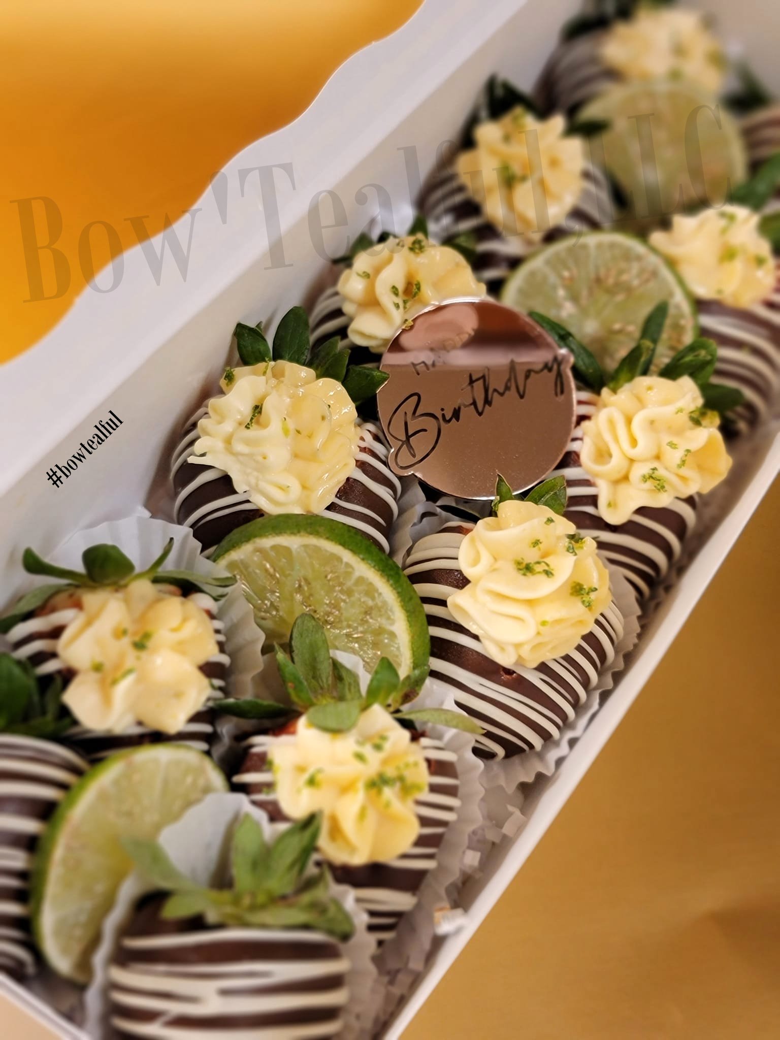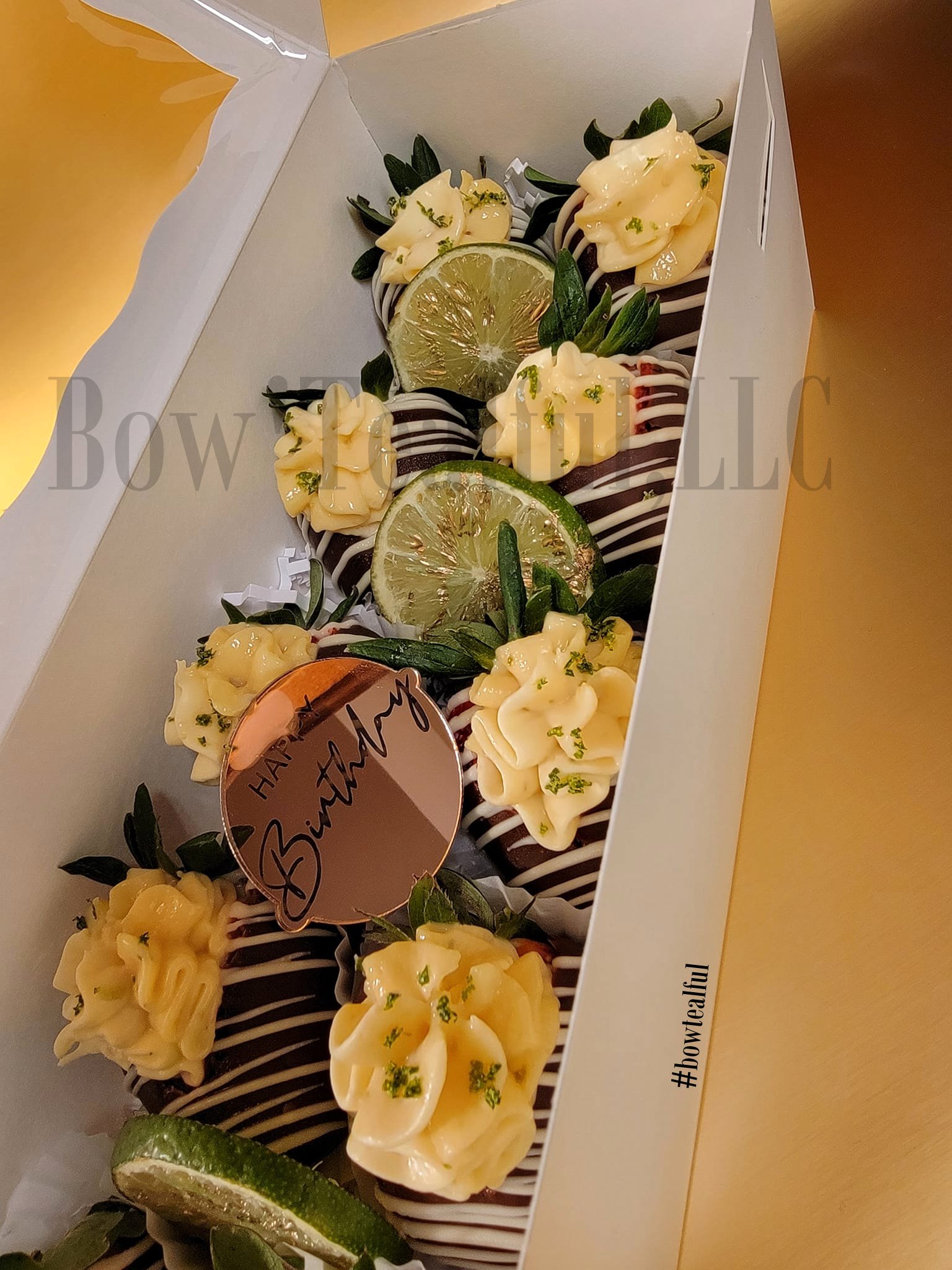 Experience the ultimate flavor combination with our Key Lime Stuffed Chocolate Dipped Strawberry Bites. Rich, velvety chocolate and tangy key lime pie filling come together in perfect harmony. Order now and enjoy a dozen hand-dipped strawberries, guaranteed to impress. Please note that 48 hours' advance notice is required, and don't forget to select delivery at checkout.